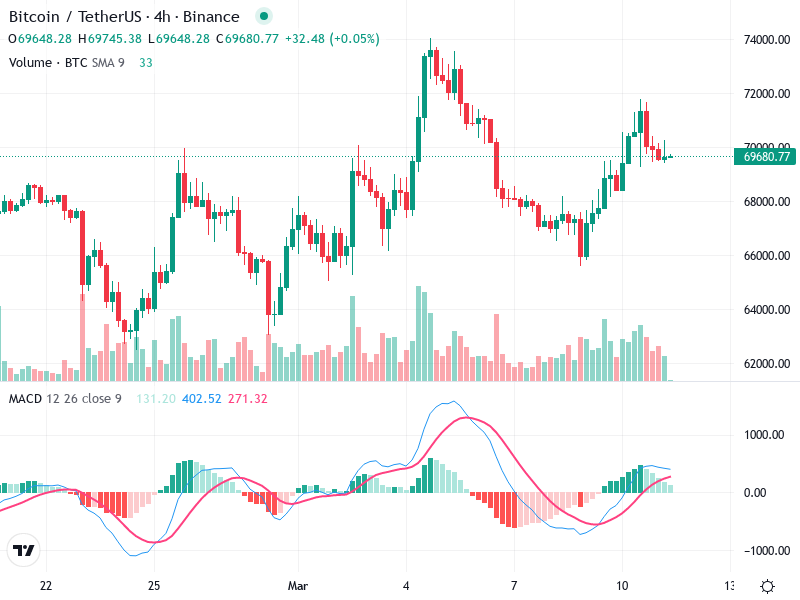 The Bitcoin/TetherUS chart reveals a recent bullish crossover indicated by the MACD, suggesting potential upward momentum.
