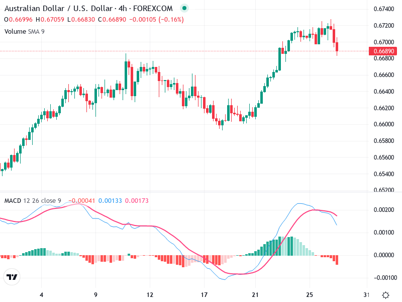 The AUD/USD chart shows a series of bullish candlesticks leading up to a recent peak. A bearish candlestick follows, indicating a potential reversal or pullback. The 0.6700-0.6720 area is a critical resistance level, while support is seen around 0.6660. Traders should watch for signals near these levels.