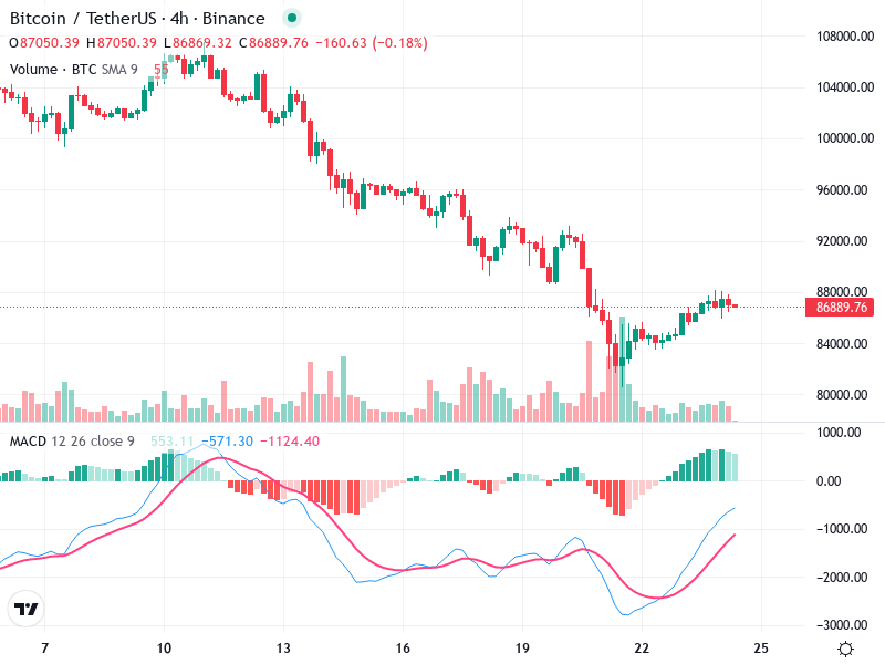 The Bitcoin/TetherUS chart reveals a recent bullish crossover indicated by the MACD, suggesting potential upward momentum.
