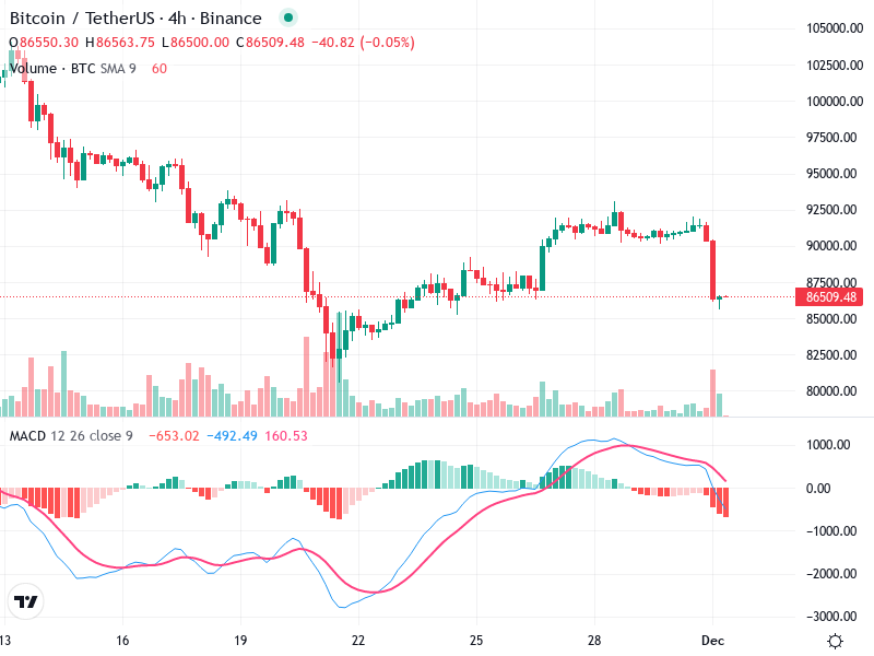 Monitor if the price can sustain below the 87,500 level and look for further confirmation of bearish continuation or a reversal signal near the potential new support at 85,000.