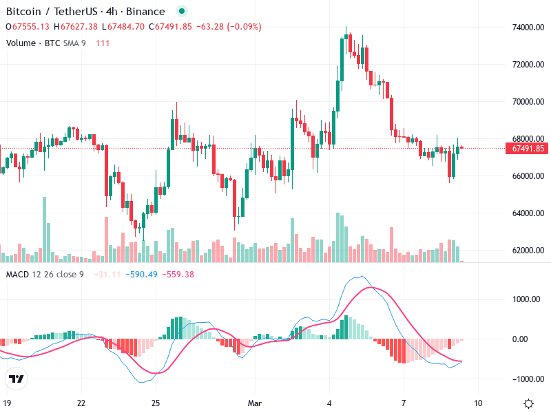 The chart nears a former resistance zone at 69000. Sustained movement above this level is crucial for breakout confirmation.