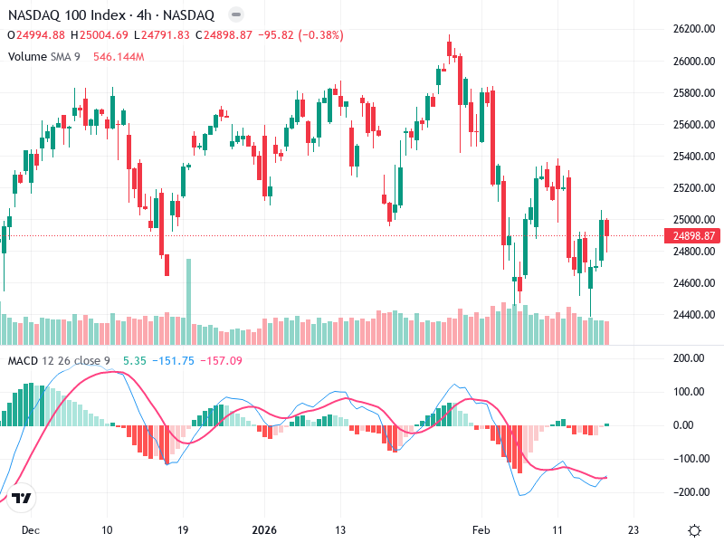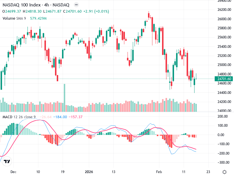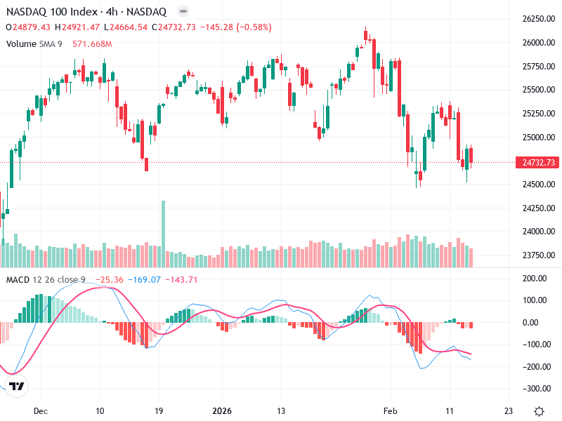 The MACD line is below the Signal line, indicating a bearish crossover in the recent past.
