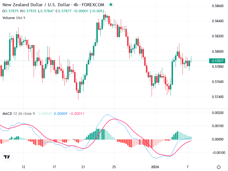 Exercise caution for potential declines if the price fails to sustain above 0.5800, and monitor for a possible bearish MACD crossover.
