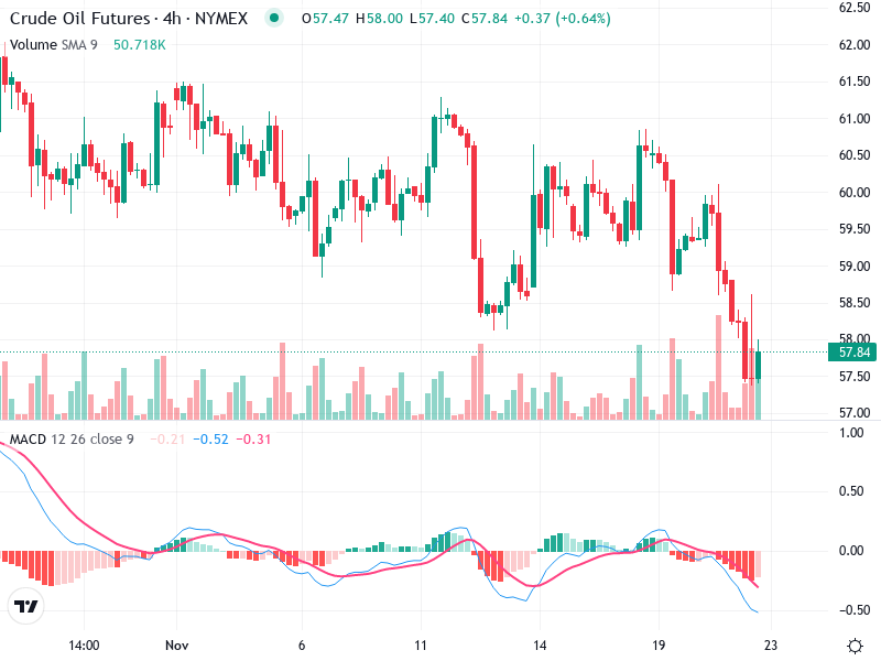 The 57.50 level appears to act as a key support zone. A break below this level with volume may indicate further downside potential.