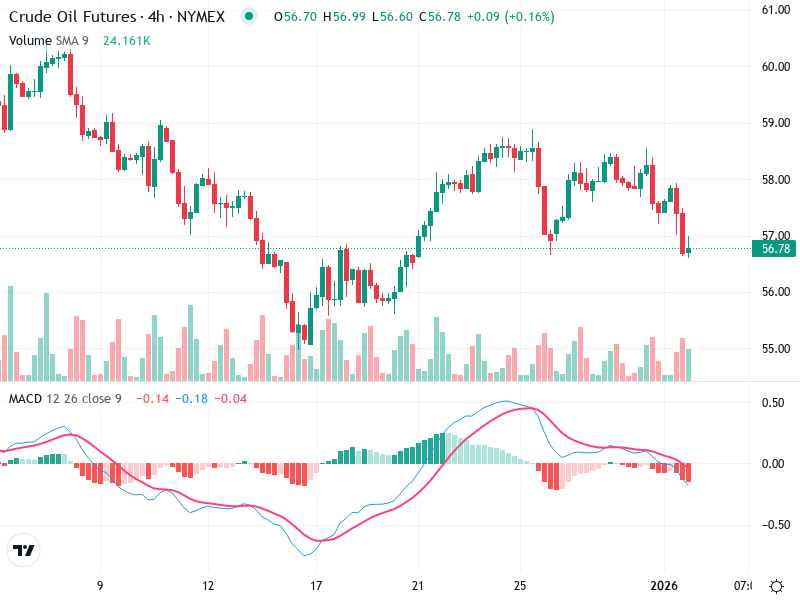 The Crude Oil Futures chart currently exhibits a mixed sentiment. The asset has been experiencing sideways movement with a slight bearish bias. Key technical indicators suggest careful monitoring of the $56 and $58 levels for potential trades.